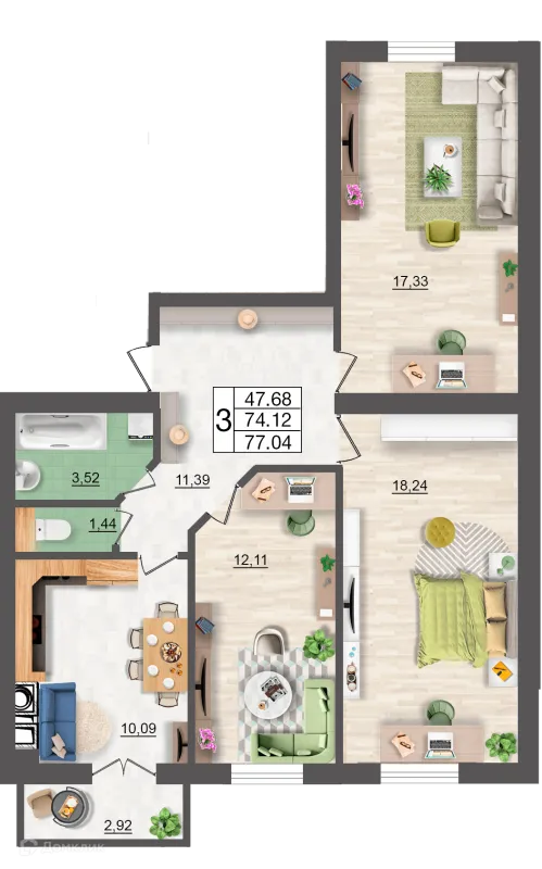 3 комн. квартира в Смоленске в ипотеку от 34 373 руб/месяц